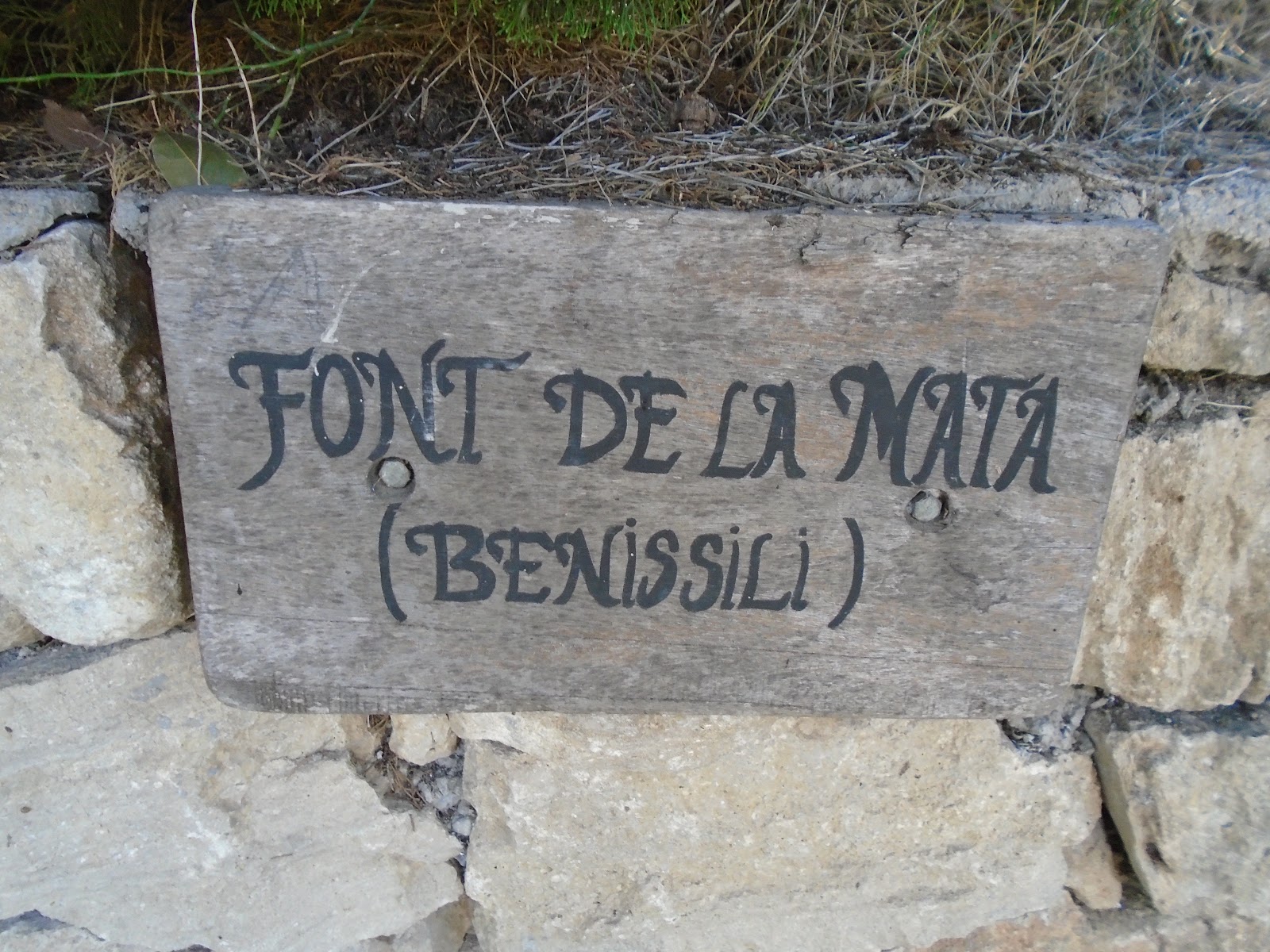 A la cresta de la muntanya es retallen unes runes i Biel ens comenta que és el castell d'Alcalà a l'ombria de Benissili, fem una mica de rogle i seguim parlant de Llombai, ara vora la font que raja sense parar, després eixim cap a la carretera, recorde la lectura de Bernat Capó parlant del pal on deia Llombai, dient que Llombai ja té noves infraestructures, en 15 anys la cosa ha millorat una mica i ara hi ha el panell de la ruta dels 8 pobles que cusen tots els pobles de la Vall de Gallinera.