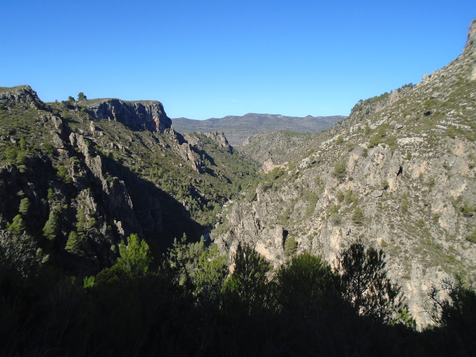 En eixir del laberint de sendes arribatem a l'altre vessant on una nova vista inundava el paisatge i la comarca del Comtat apareix al nostre davant, com en un esclat més proper el pantà de Beniarrés i un teixit de bancals de cirerers com una manta acolorida sobre la muntanya. Més amunt com un senyor que té cura de les seues terres el Benicadell . En pocs metres, en canviar de vessant una altra comarca i un altre paisatge.