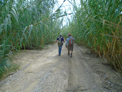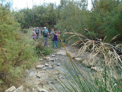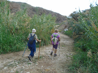 El terreny era molt muntanyós i escarpat, amb la constant del paisatge llunar pintat de petites taques verdes de vegetació aïllada, ara però, les boges no pintaven de groc les muntanyes com a la caminada de la primavera. Davallàvem cap al riu Montnegre, també l'erosió de les argiles serà una constant i les formes que van prenent els marges del riu, era una geografia canviant, vàrem arribar al riu i caminàvem entre canyars i formacions argiloses dibuixades pel temps i l'erosió. Vàrem arribar al Montnegre de Baix, un petit poblet, on vora el riu unes hortes molt ben treballades trenquen amb la resta de paisatge feréstec, esmorzem a una caseta on hi ha una tauleta i un jardí, un llaurador puja amb el moto-carro i una mica de collita de tomates, després varen vindre els amos de la caseta i ens van parlar de la possibilitat de seguir caminant pel riu. Nosaltres però en acabar l'esmorzar vam pujar a buscar la carretera, en agafar una mica d'altura i allà al fons destacava el riu de canyes que amagava el riu Montnegre.