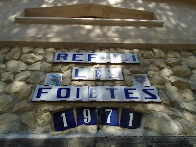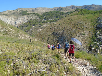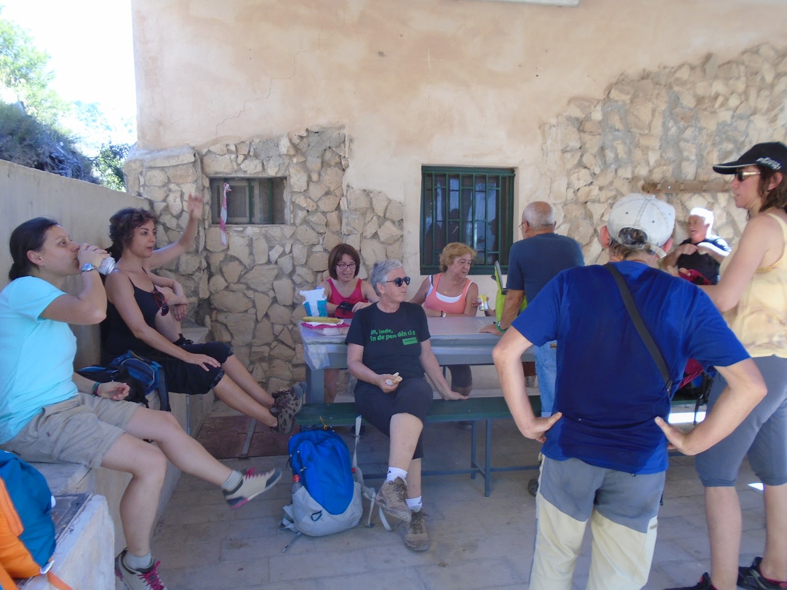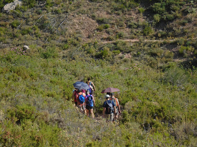 Alguns paraigües apaivagaven la calor de la gent, i ens donava una imatge curiosa al grup. Vàrem arribar a l'alberg de les Foietes del centre excursionista de Cocentaina, allí vàrem descansar i vàrem fer un mosset, gràcies Jose.