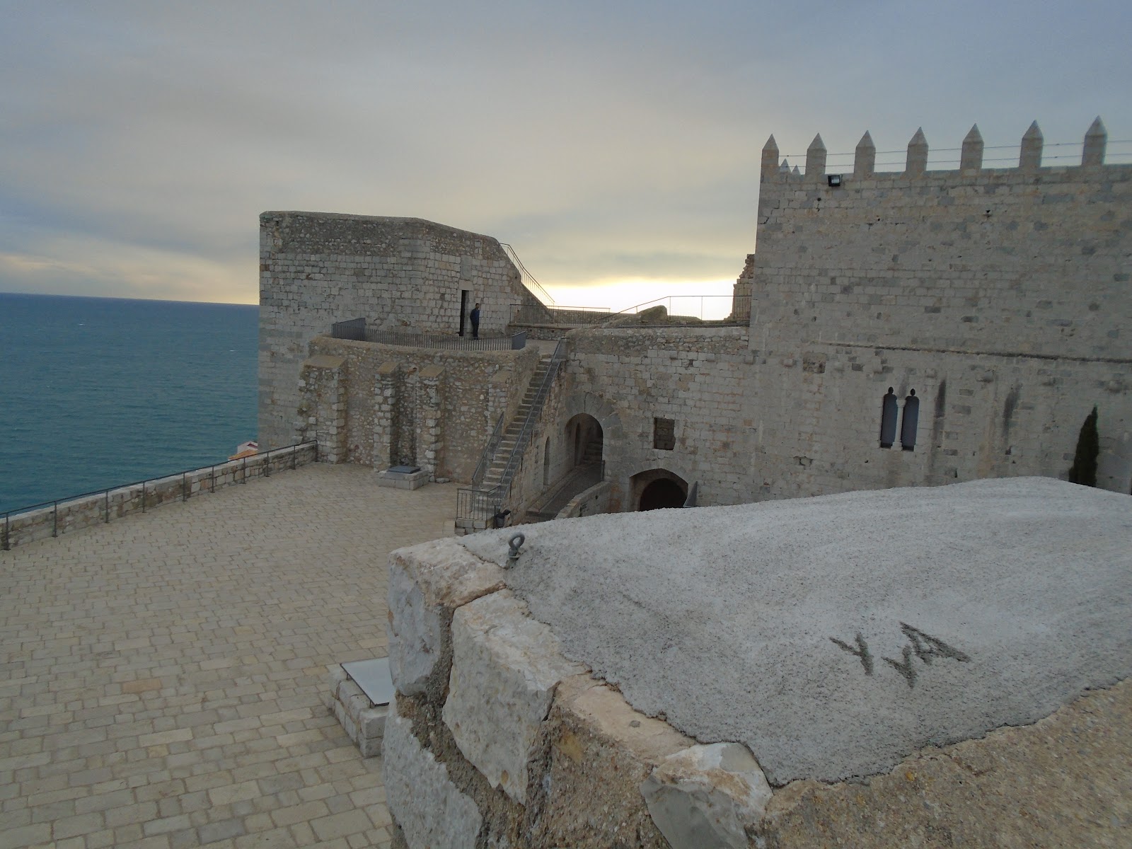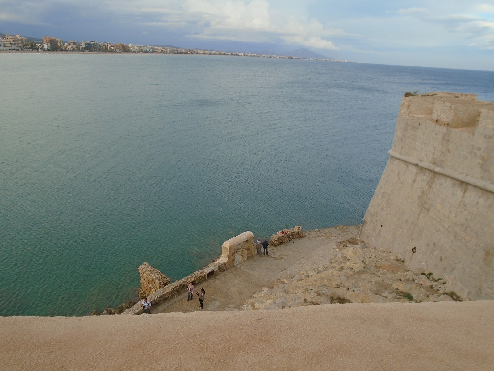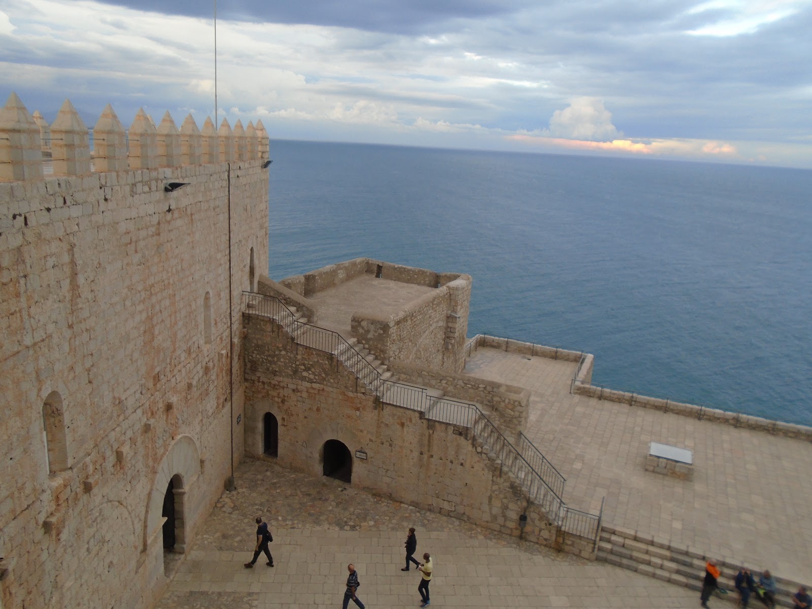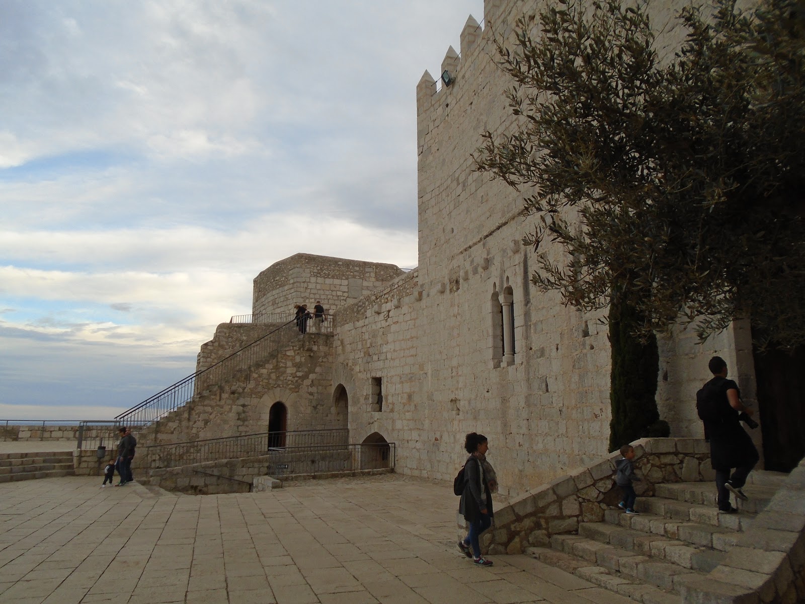 En passar vora muralla Paco ens va mostrar a l'esquerra el bufador, en dies de maror la mar travessava el carrer per sota i pel forat ensopegava amb la roca i esclatava l'escuma, hui sols es sentia la remor de l'aigua. Seguíem pels carrers de Peníscola, passàvem per una casa folrà de petxines, curosament posades, anomenada "la casa de la concha". Seguíem caminant pels carrers empedrats coronats per cases emblanquinades . Ens vam dirigir als jardins del castell. Una vegada les entrades a la mà ens disposàvem a entrar, però per sobre de la bellesa de l'indret amb palmeres vora mar, una fiblada ens feria els ulls, per voler donar-li una aire medieval havien clavat a terra algunes aus rapaces amb una cadena, els pobres animals no es podien moure i si intentaven volar es pegaven un sotrac amb la cadena, però per acabar de rematar el mal de cor, hi havia escampats sobre la gespa alguns pollets menuts morts que les aus anaven esmicolant, una escena molt desagradable. Vàrem deixar els jardins per pujar al castell, després de pagar l'entrada vàrem passar per un replà , una visió impressionant de les muralles i de la costa de Benicarló es podia veure. Poc després vàrem entrar dintre les estances del castell, vàrem passar per les diferents sales, les cavallerisses, el menjador on podíem veure alguns estris, la presó, una sala sense finestres que sota una reixa apareixia als nostres peus, em venia una tremolor de pensar les condicions que havien de patir els presos.