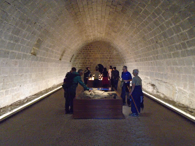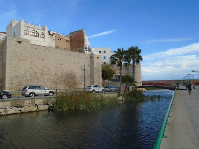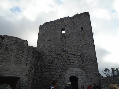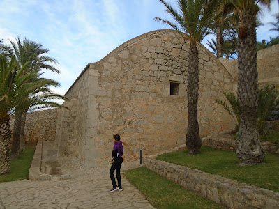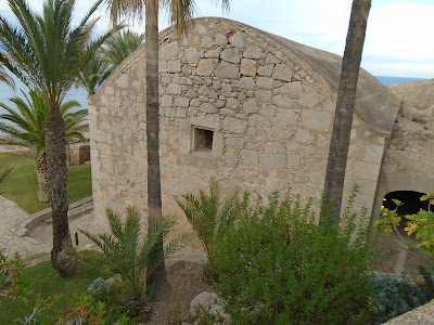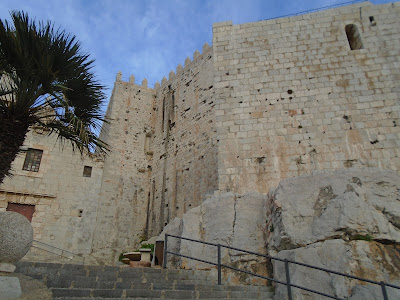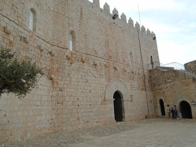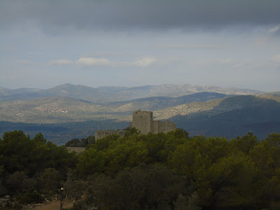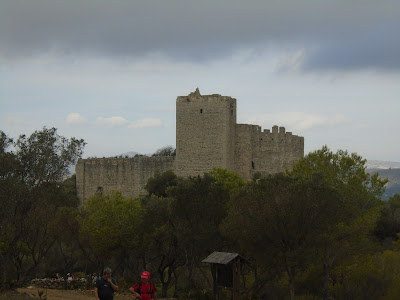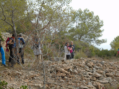 Ens vam trobar a la plaça de Santa Magdalena el grup de Caminants per iniciar la marxa, que com sempre hi havia gent de diferents comarques, en especial gent de Peníscola i d'altres zones del País Valencià. Iniciàvem l'eixida passant per davant de l'eglésia i després vam seguir entre camps d'oliveres i conreus de seca, després iniciàvem la pujada cap al castell de Polpis. Vam fer una primera pujada per una senda empedrada ombrívola i costeruda que anava enfilant-se fins la fortificaició. Vam respirar després de la fatigada pujada als peus del castell, vam passar pel costat dels merlets que tan em recorden al meu bloc, per ser la foto de portada, sempre m'agrada acaronar les pedres del castell , com per intentar veure i sentir tot el que elles han passat, després creuàvem la porta de pedra del castell fins entrar a l'interior. Una vegada dintre Paco ens va fer una explicació de la història del castell. Del qual sols queden alguns llenços i alguna torre, també l'aljup. Un apunt que ens fa Paco és la referència als arbres que hi trobem, és el garrofer del dimoni, són arbres centenaris i els utilitzaven per enverinar les fletxes que es llançaven des del castell cap als atacants, sobre tot el verí es trobava a les tavelles. Cap a la tardor el garrofer rebrota i cap a la primavera hi cauen les fulles, és un arbre de l'hemisferi sud, fa el cicle a l'inrevés que la majoria per adaptar-se a les estacions d'estius secs i hiverns plujosos. És un castell del segle XI, segurament hi hauria una fortificació anterior.