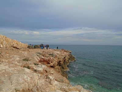 Del poblat quedaven algunes restes de murs i algun arc, seguim davallant fins arribar a la mar, algunes persones s'acostaven a les ones per tocar l'aigua. Ara seguíem per una pista vora mar on les ones anaven trencant-se sobre la roca de la costa fent petites cales, esmicolant les pedres . El nostre punt de mira era la torre Badum, una torre de guaita que teníem al nord on dinaríem.