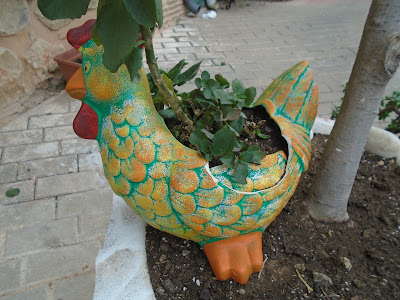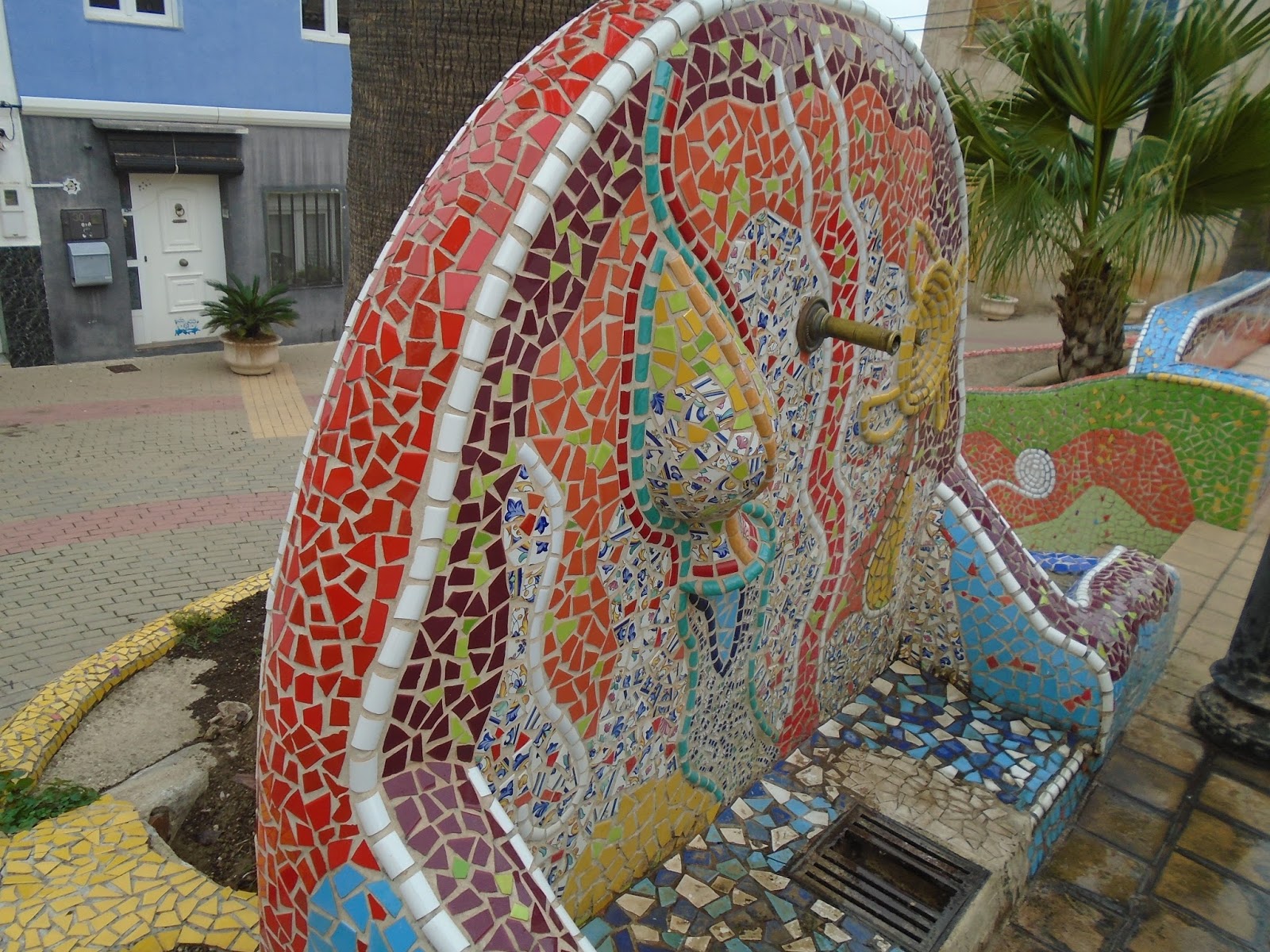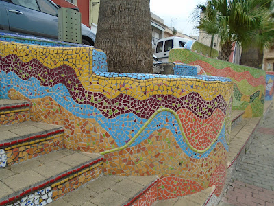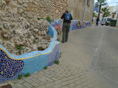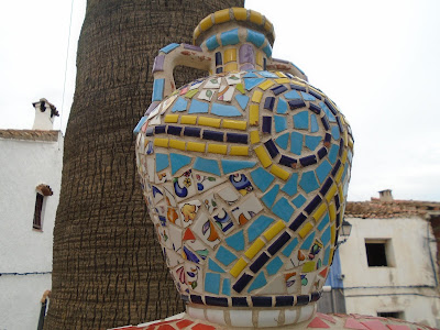Finalment  vam arribar al poble. Una de les sorpreses en arribar a la població van ser els trencadissos  de colors  escampats per tot el poble  formant part de canterelles, escales, jardineres, als mateixos llavadors, totes aquelles rajoletes esmicolades i posades curosament fent formes i colors  feien d'aquell poble un encant i el plaer dels vianants, després vàrem  anar a dinar.