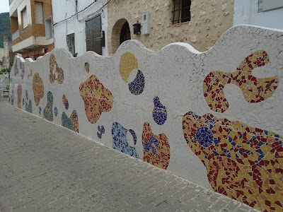 Finalment vam arribar al poble. Una de les sorpreses en arribar a la població van ser els trencadissos de colors escampats per tot el poble formant part de canterelles, escales, jardineres, als mateixos llavadors, totes aquelles rajoletes esmicolades i posades curosament fent formes i colors feien d'aquell poble un encant i el plaer dels vianants, després vàrem anar a dinar.