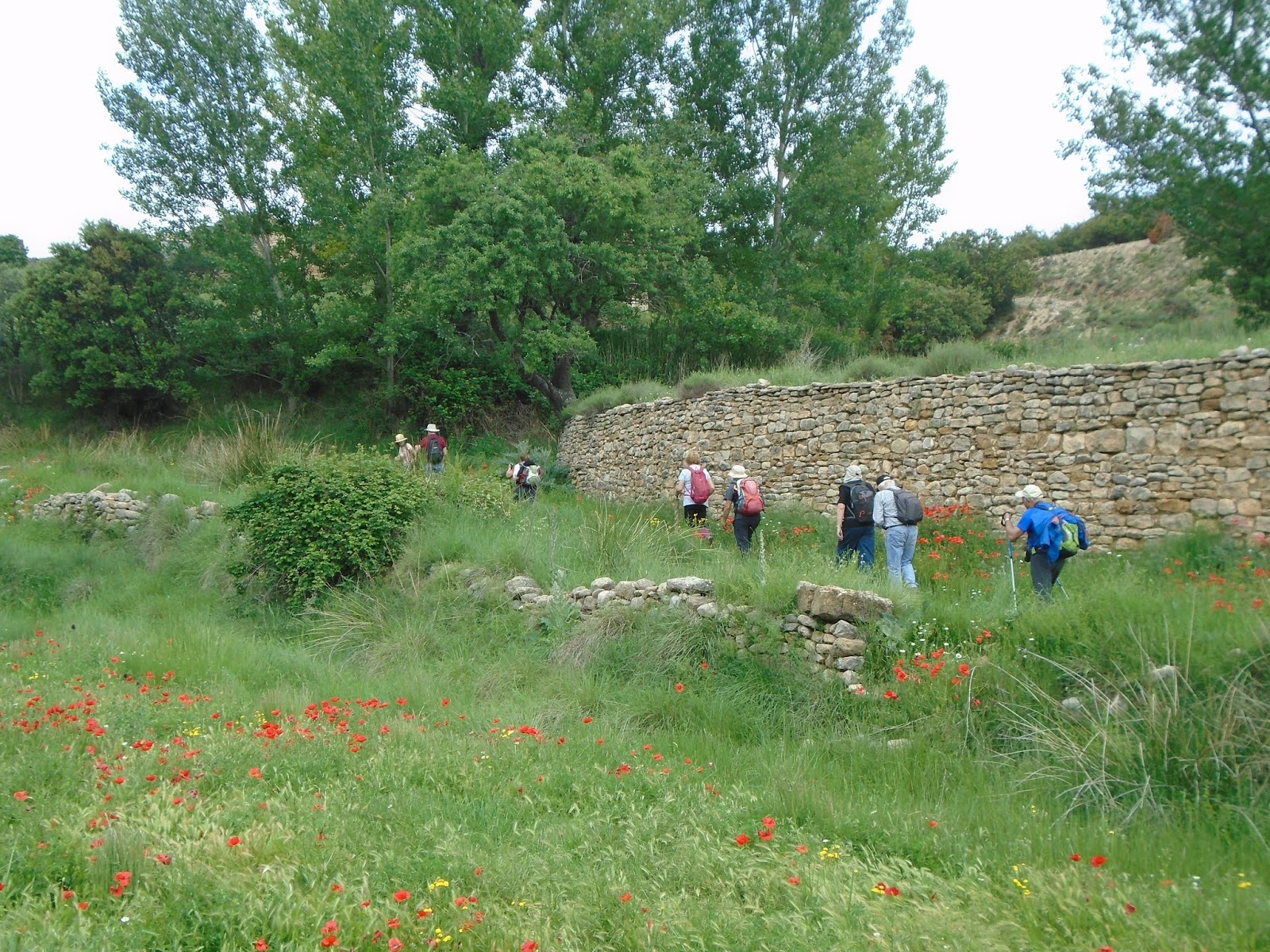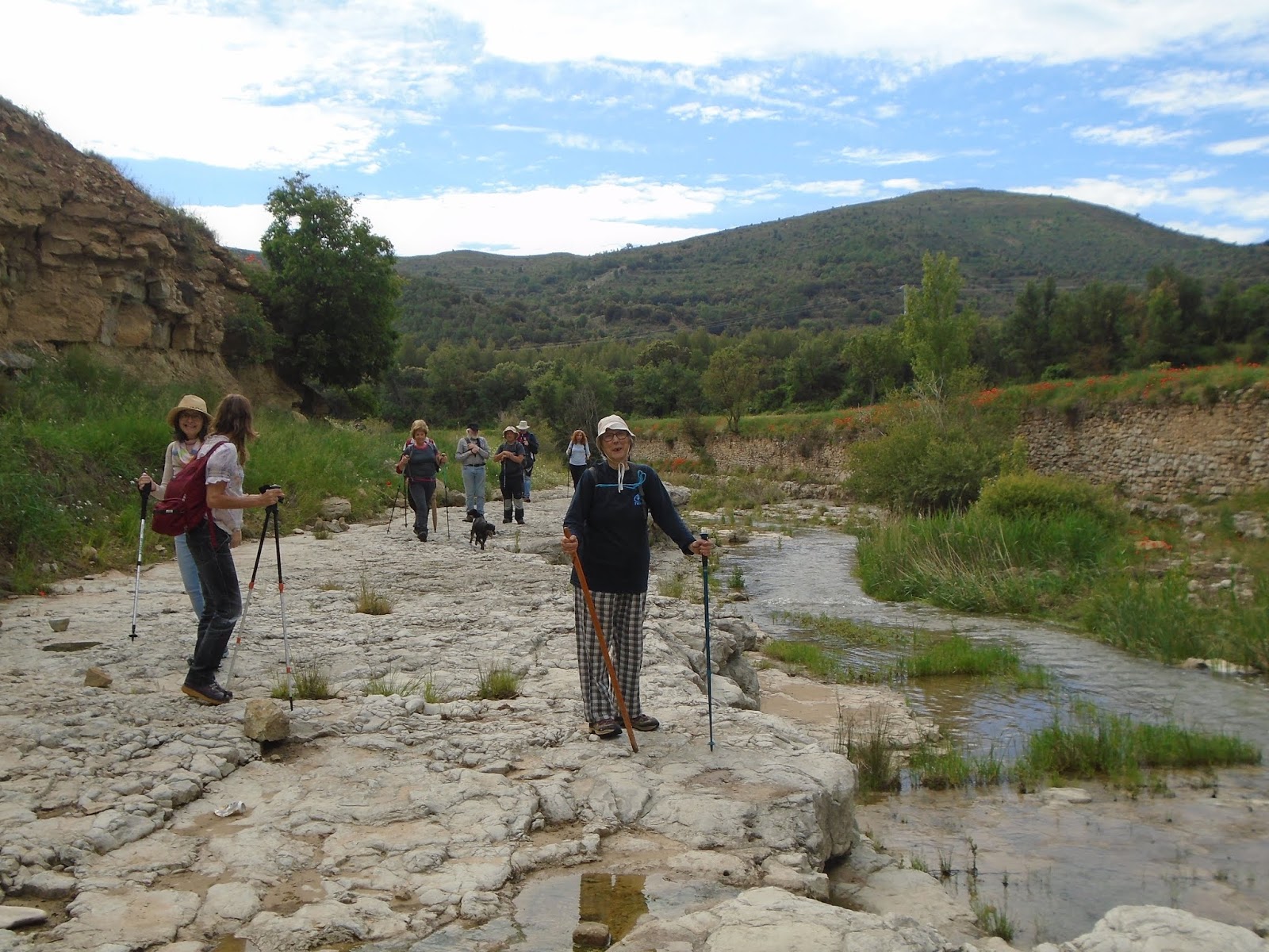 El riu Cantavella  que brollava ufanós després d'un hivern de pluges  ens acompanyava,  i feia ressonar el seu cant d'aigües clares a cada racó i a cada meandre. La senda anava seguint paral·lela a la llera del riu.  Un hortet  creixia a la vora, amb els conreus d'estiu encara molt tendres,  recordant-nos la duresa i la llargada de l'hivern per aquestes contrades, i que els cicles de la terra no eren   com a la Plana  on l'oratge era  més suau. Vàrem seguir el rierol  fins que ens va portar a l'assut, on les aigües regolfaven per dalt . El paisatge de flors i aigua, ens embriagava els ulls, i anàvem notant  un sentiment col·lectiu, que ens omplia de joia. A cada cantó ens feiem fotos de grup per perpetrar cada instant, i cada  moment de joia i de comunió amb el paisatge.