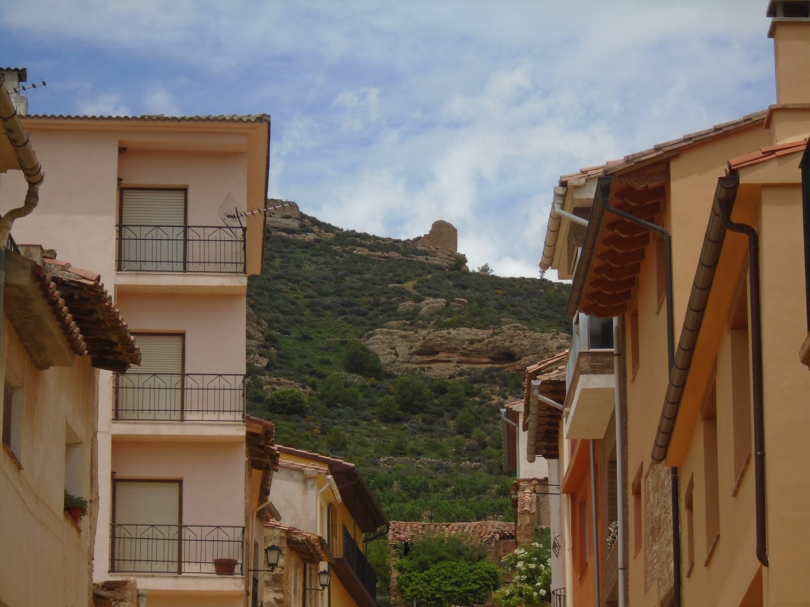 En passar un coll Olocau es veia davant nostre, com immers dintre d'una petita vall, en una de les muntanyes que el coronava ressorgien les restes del castell d'Olocau.
