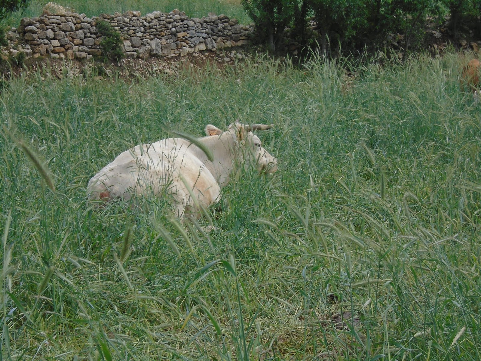 Darrera d'un marge de pedra seca hi sobre un camp de cereal  pasturaven unes vaques que gaudien de l'herba fresca.