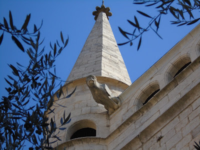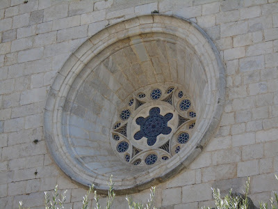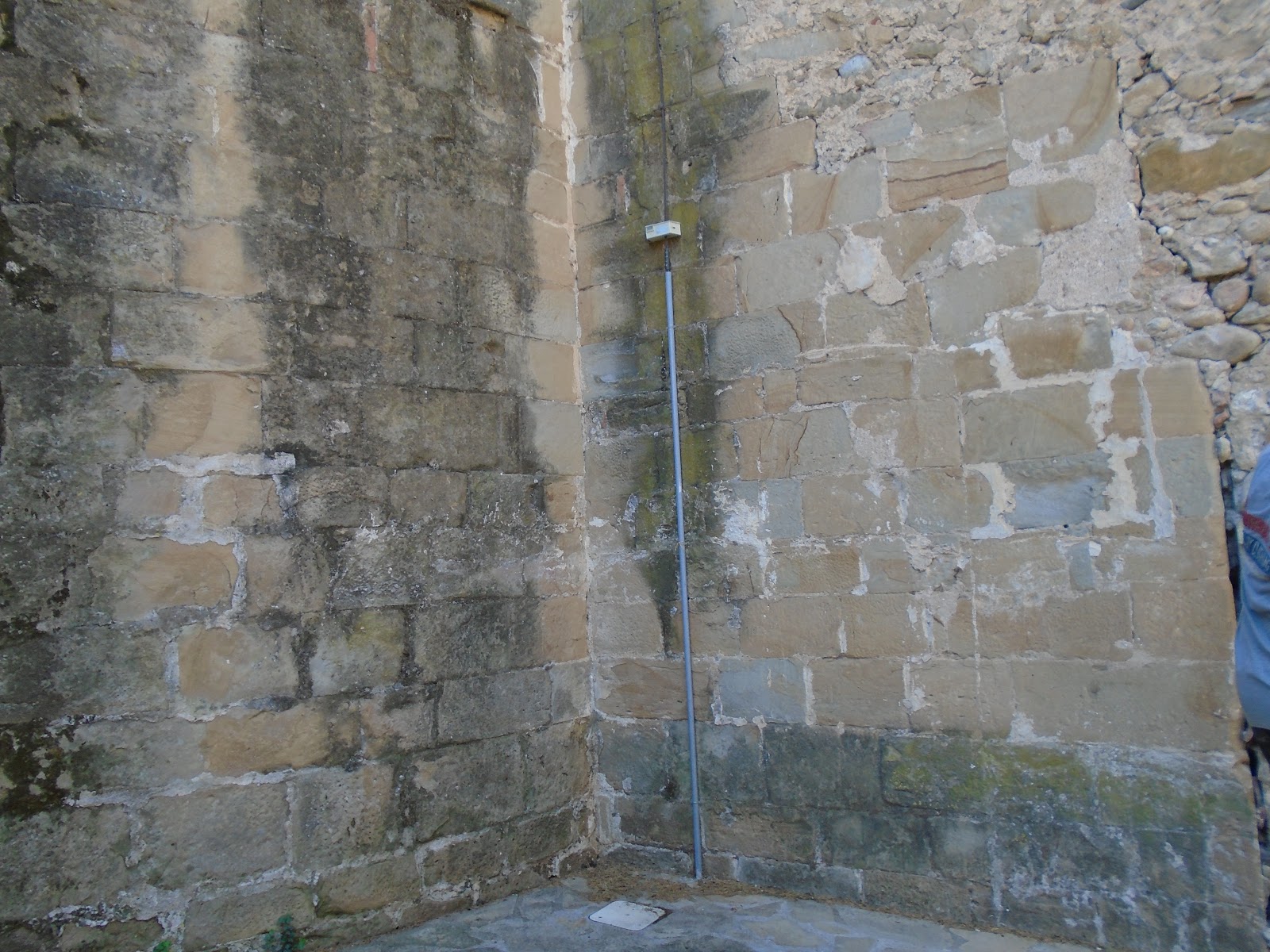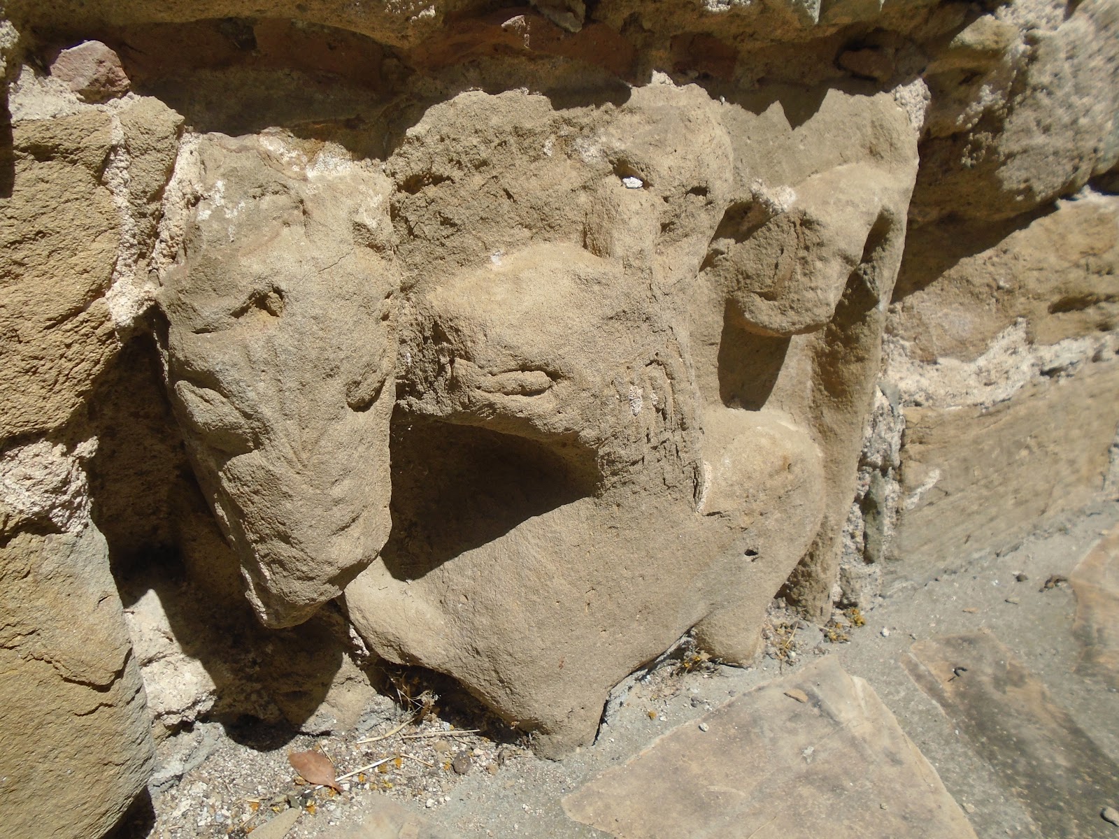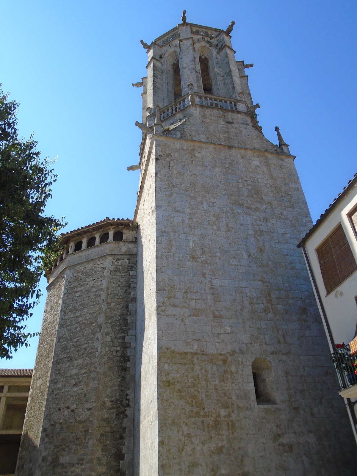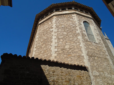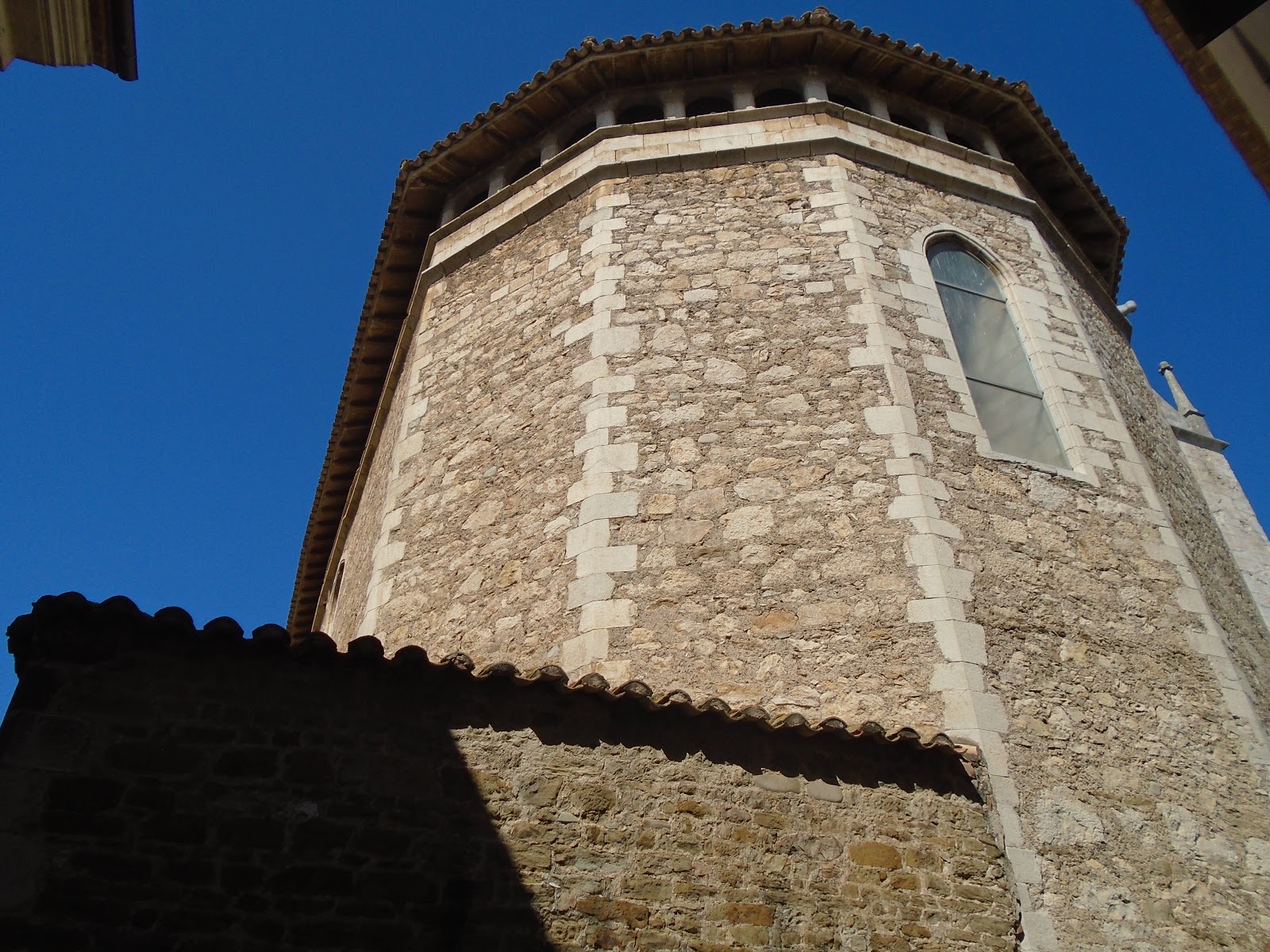 Arribem a l'església, veiem la zona de l'absis de l'església romànica, després s'afegeix la part gòtica, del reciclat del romànic es va fer el campanar. Aquesta portada és de les poques que ha sobreviscut, a la palceta de davant hi havia un cementeri. En un racó de la placeta, en  una de les parets laterals veiem l'escultura d'un griu.