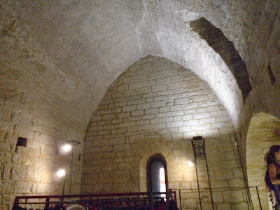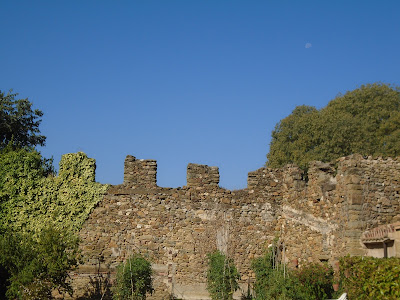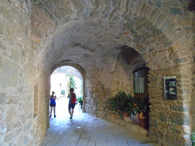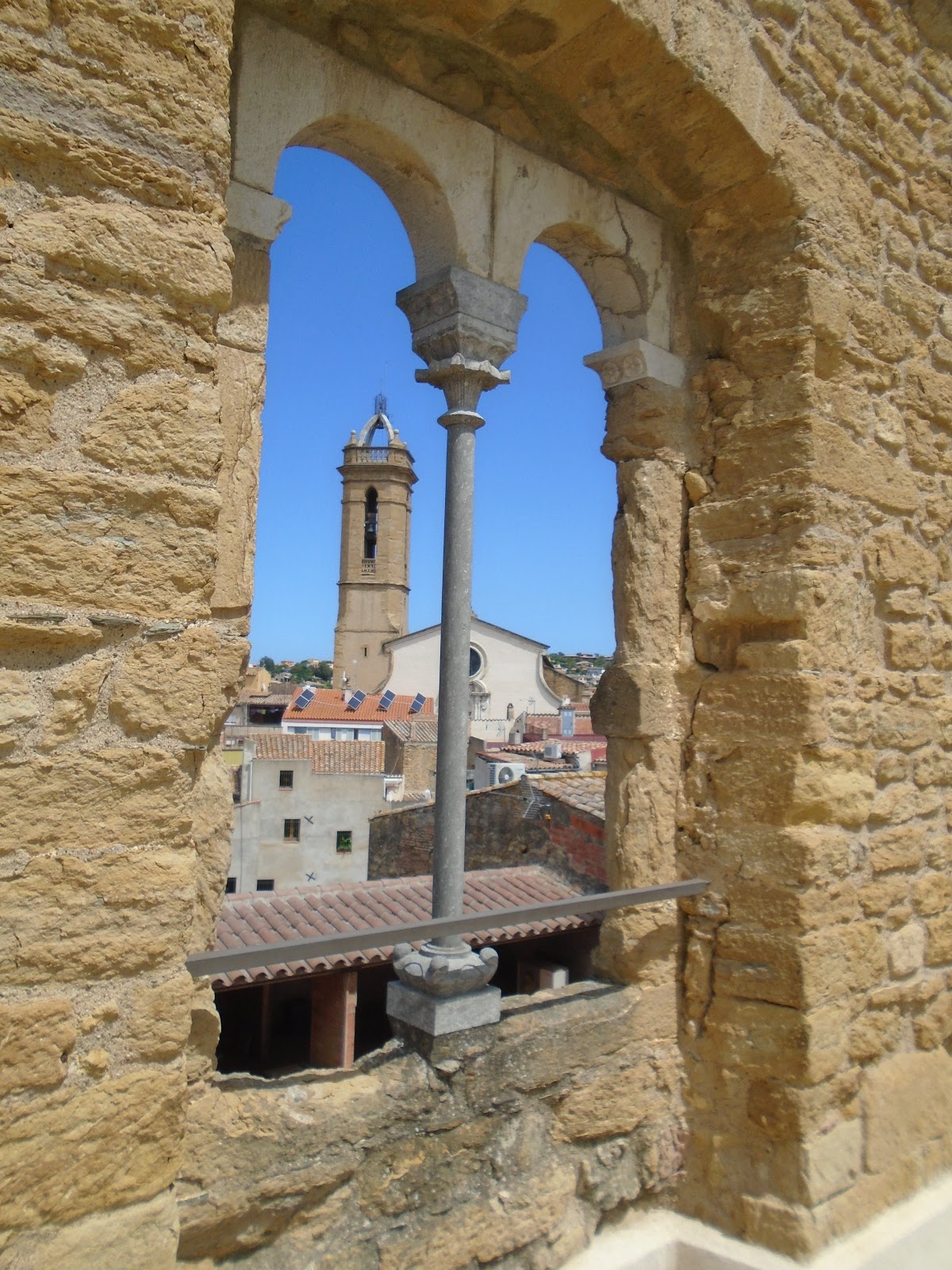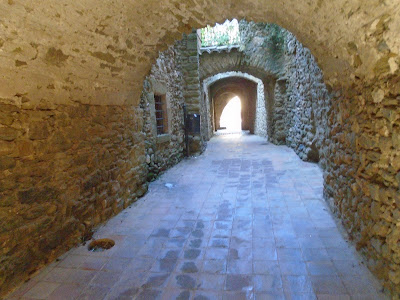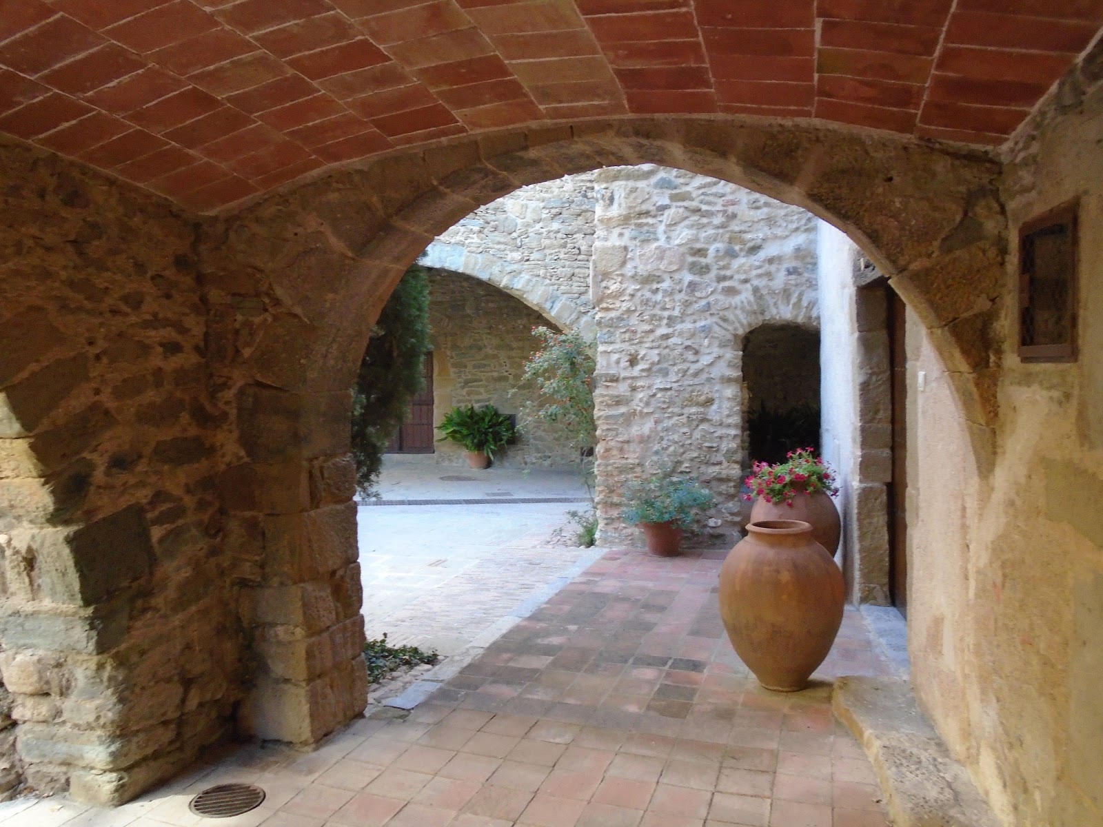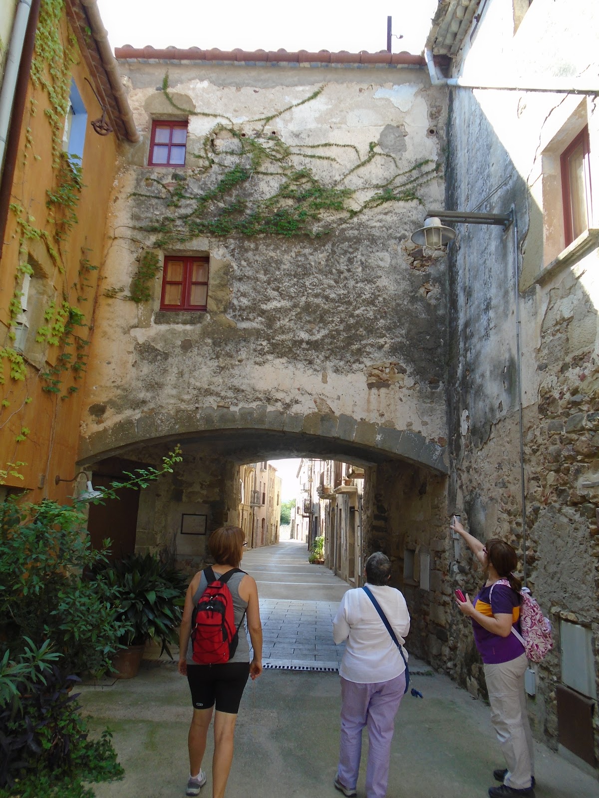Pilar ens va contar algunes coses respecte aquesta perla preciosa, Monells, els seus carrers estrets de pedra i la quantitat de voltes de canó que s'alçaven als nostres caps ens van sorprendre. Hi ha tres tipus de voltes depenent dels materials: de pedra, de rajola, i de canyís. A les fotografies podreu veure'n algun exemple. També hi  havia hagut restes de muralles, en pujar al castell veiem algun merlet, i una vista del poble de Monells.