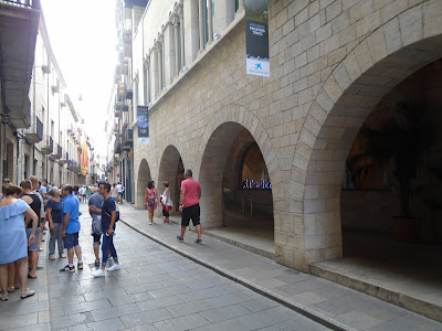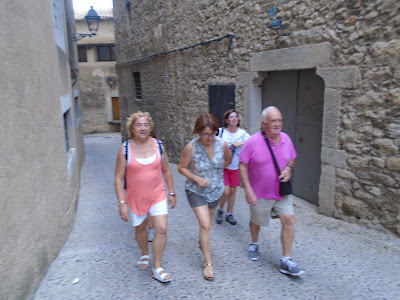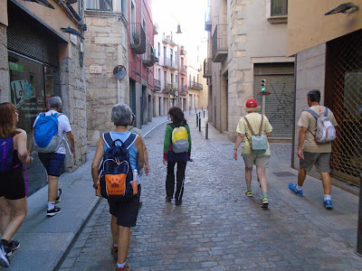 El dia 8 d'agost ens vàrem trobar a Girona, vàrem deixar les motxilles a l'alberg Cerverí i Pilar ens va fer una visita guiada per Girona, entre altres coses vàrem recórrer la plaça del Vi, era la plaça més important on es feien totes les congregacions i trobades de castells. Pilar ens va presentar en Banyeta, antigament era un home que sempre es posava al cantó de la plaça i era molt agarrat, li van fer la cara de pedra, i ara qui li toca el nas d'un bot li perdonen els impostos.