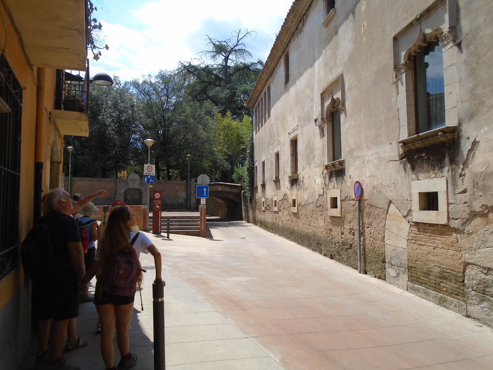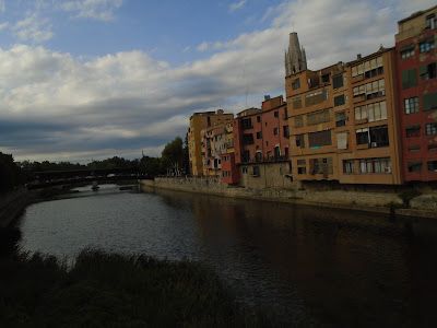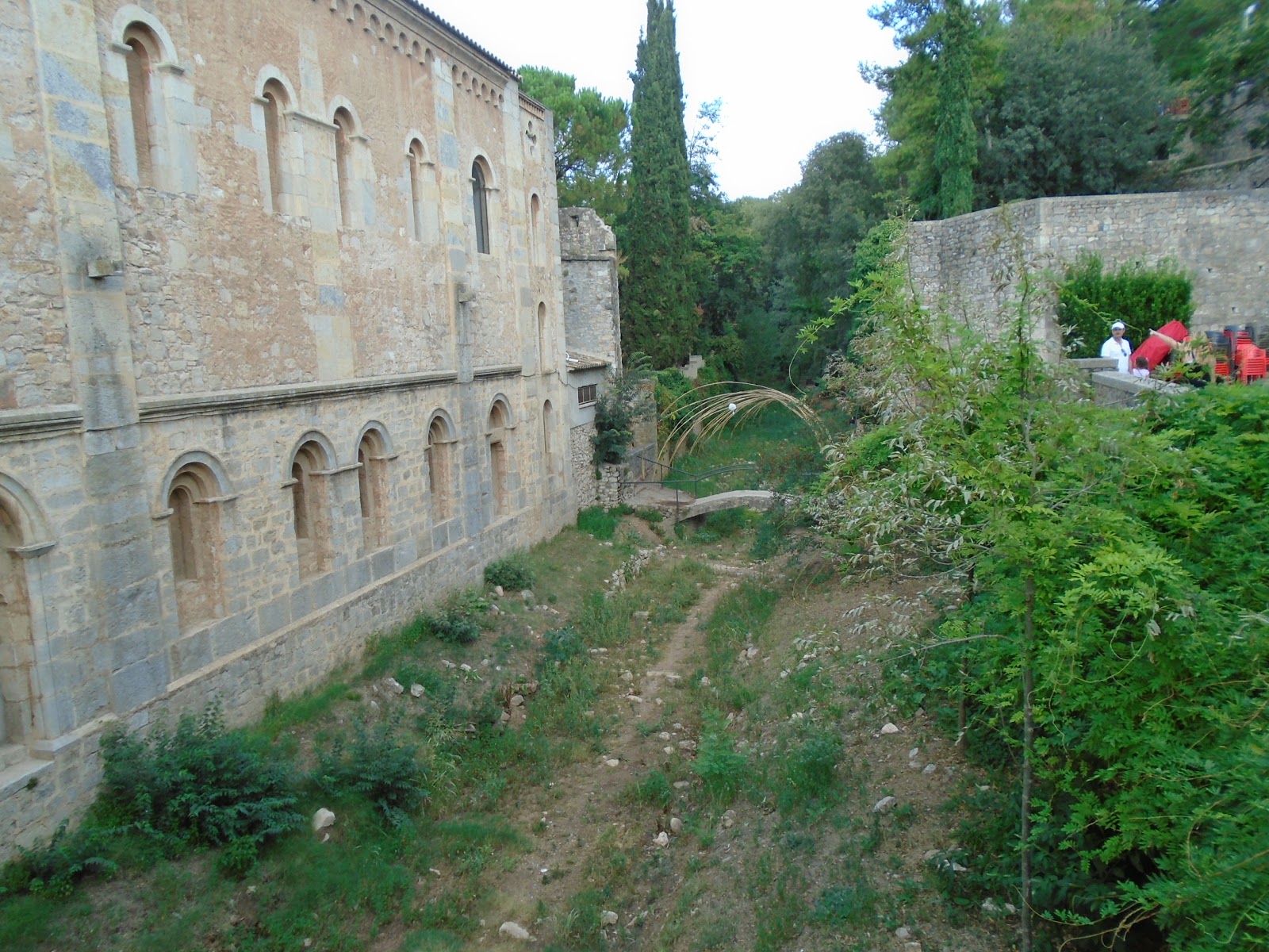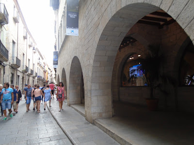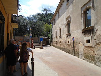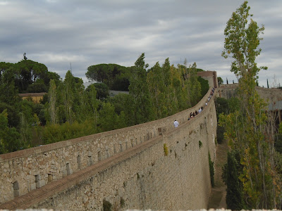 Fem una volta vora la muralla, veiem les grans pedres a la part de sota que resalten la part romana de la muralla, passem prop dels banys àrabs, també ens apropem als jardins de John Lenon, on l'edificació fa com un palau castell. En passar el riu Galligants veiem el monestir de Sant Pere de Galligants, molt bonic el rosetó del monestir. Des del monestir es veu l'àngel de dalt de la catedral que és un penell que es mou.