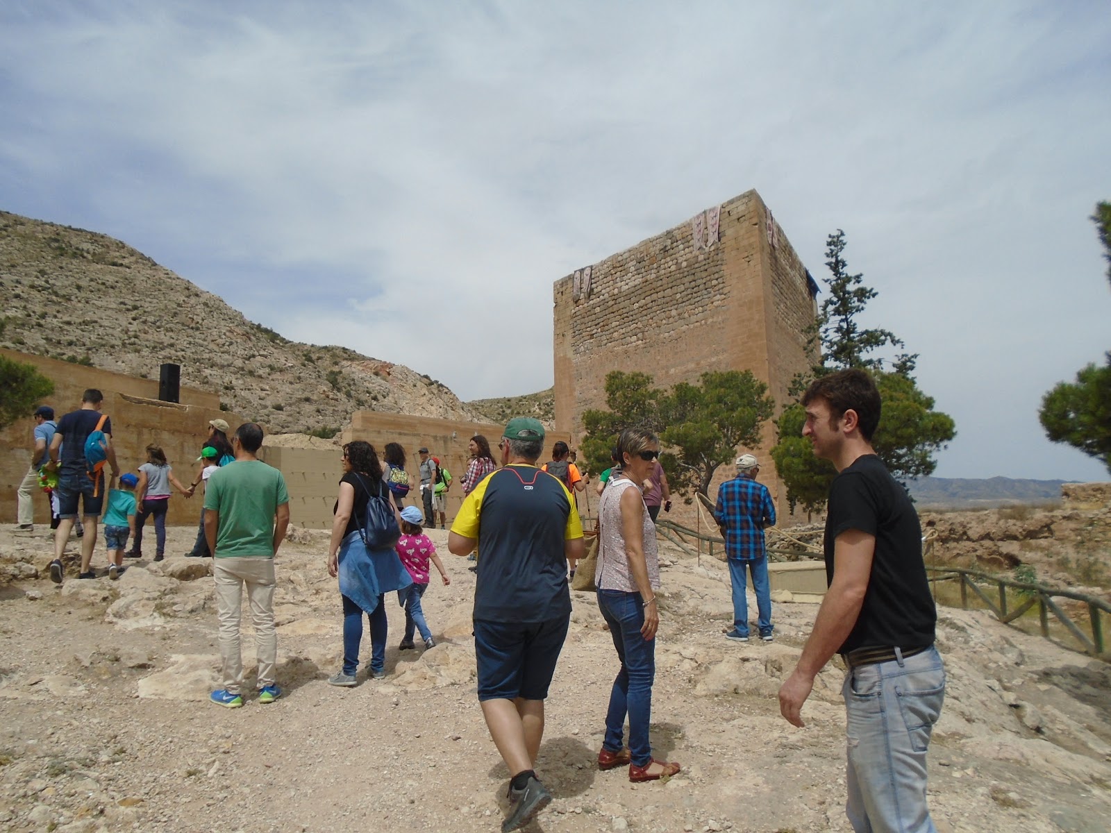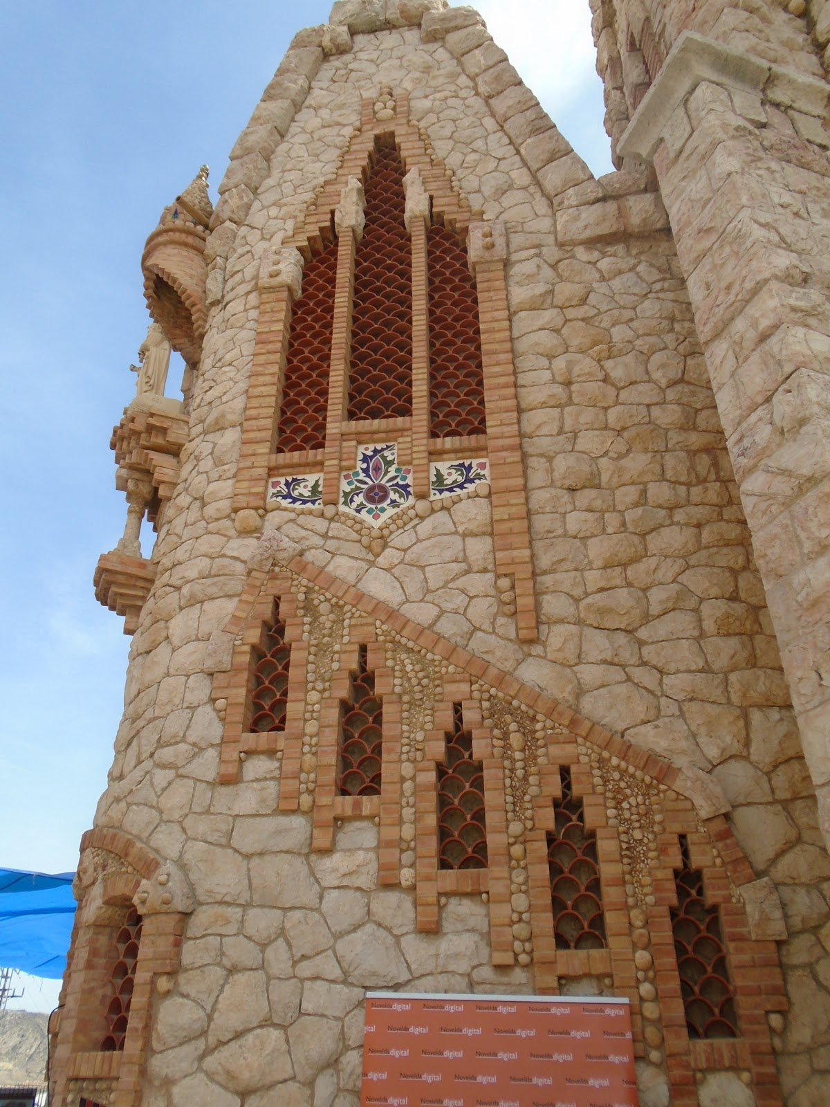 Allí sota una ombra vam esmorzar, gaudint d'aquella meravella i de l'ombra dels tamarits. Poc més enllà el castell i el santuari modernista començava a perfilar-se cada vegada més. Aquell diumenge hi havia molta festa al castell, amb activitats, i molta gent, i la gent menjava xanxullo, que era un plat típic de Novelda, hi havia papes, cacaus, sardinetes, musclos, tot barrejat en un sol plat.
