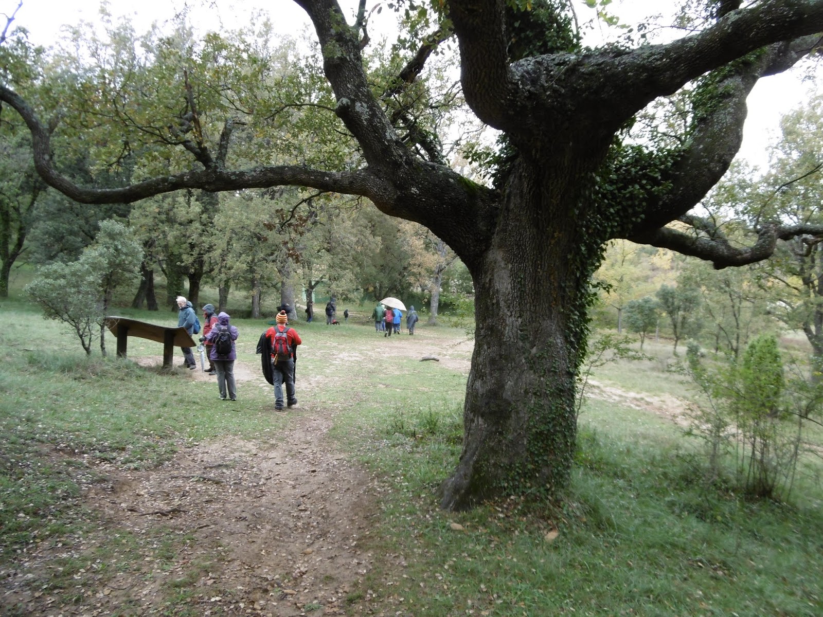 Ara entràvem en una de les zones més precioses, un xicotet assegador que es capbussava entre grans carrasques, i segons ens va contar Jesús era la part de les sorts, anomenada així ja que era una zona que es va repartir a sorts. La pluja anava calant entre les argelagues i l'arbreda, aquest fet feia més màgic el paisatge. Havíem de tenir cura sempre de no relliscar en alguna roca.