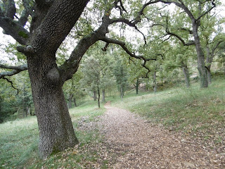 Ara entràvem en una de les zones més precioses, un xicotet assegador que es capbussava entre grans carrasques, i segons ens va contar Jesús era la part de les sorts, anomenada així ja que era una zona que es va repartir a sorts. La pluja anava calant entre les argelagues i l'arbreda, aquest fet feia més màgic el paisatge. Havíem de tenir cura sempre de no relliscar en alguna roca.